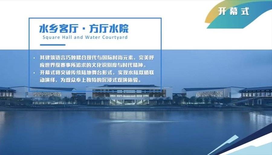 开幕式、颁奖仪式及闭幕式秉持节俭办赛原则,简洁且富创意。开幕式定于9月中旬在新启用的“水乡客厅·方厅水院”举行。其建筑语言巧妙糅合现代与国际时尚元素,完美呼应世界级赛事所追求的文化识别度与时代精神。开幕式将突破传统陆地舞台形式,实现水陆双栖联动演绎,为观众奉上独特的沉浸式观演体验。